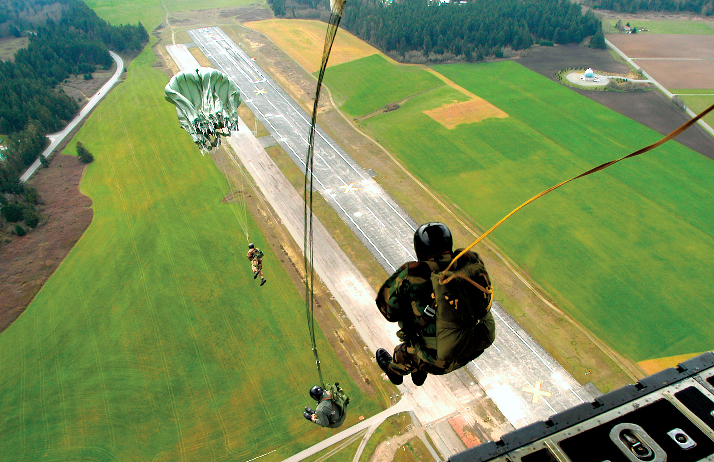 The next stage of the course consists of a parachute descent from a balloon at the dropping zone at Weston-on-the-Green. This is carried out from a height of 2400ft(800m) in what is known as "clean fatigue" - without equipment. Subsequently, trainees carry out their first descent from a C-130 or AN-32 in single 'sticks' of eight without equipment from one door of the aircraft. Their second descent is again in 'clean fatigue', in single 'sticks' of eight or ten. Trainees then make their third descent, jumping in simultaneous 'sticks' of six from both sides of a Hercules. This is followed by a night descent without equipment. Thereafter, descents are made with equipment, initially in a single 'stick' of six, subsequently in simultaneous 'sticks' of eight or ten and finally in the maximum size of 'stick' possible, depending upon the number of personnel on the course.